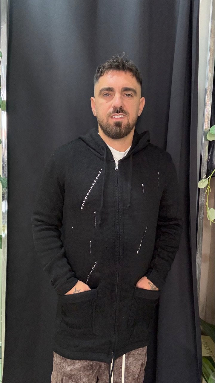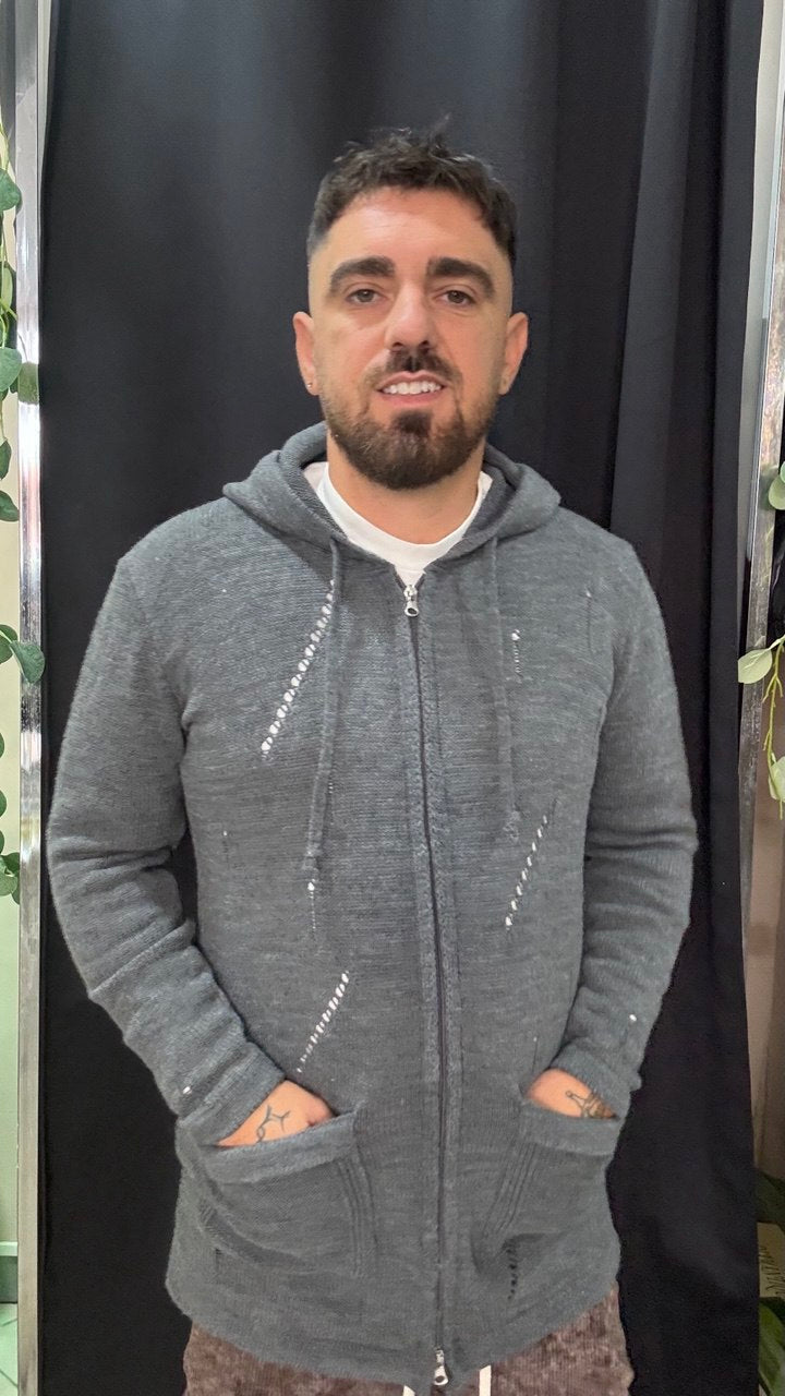 Piu' lungo dietro, chiusura con zip, tasche e cappuccio