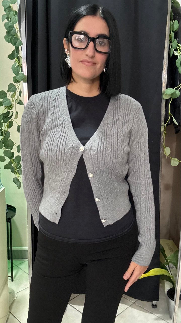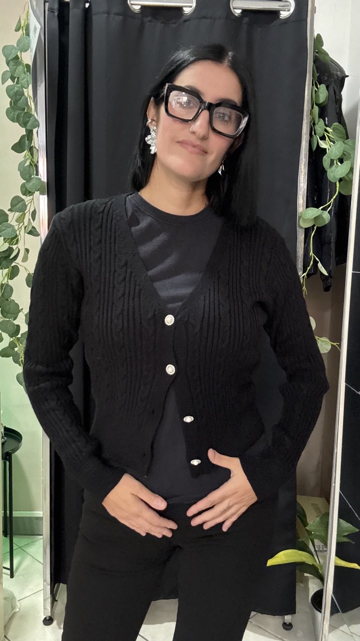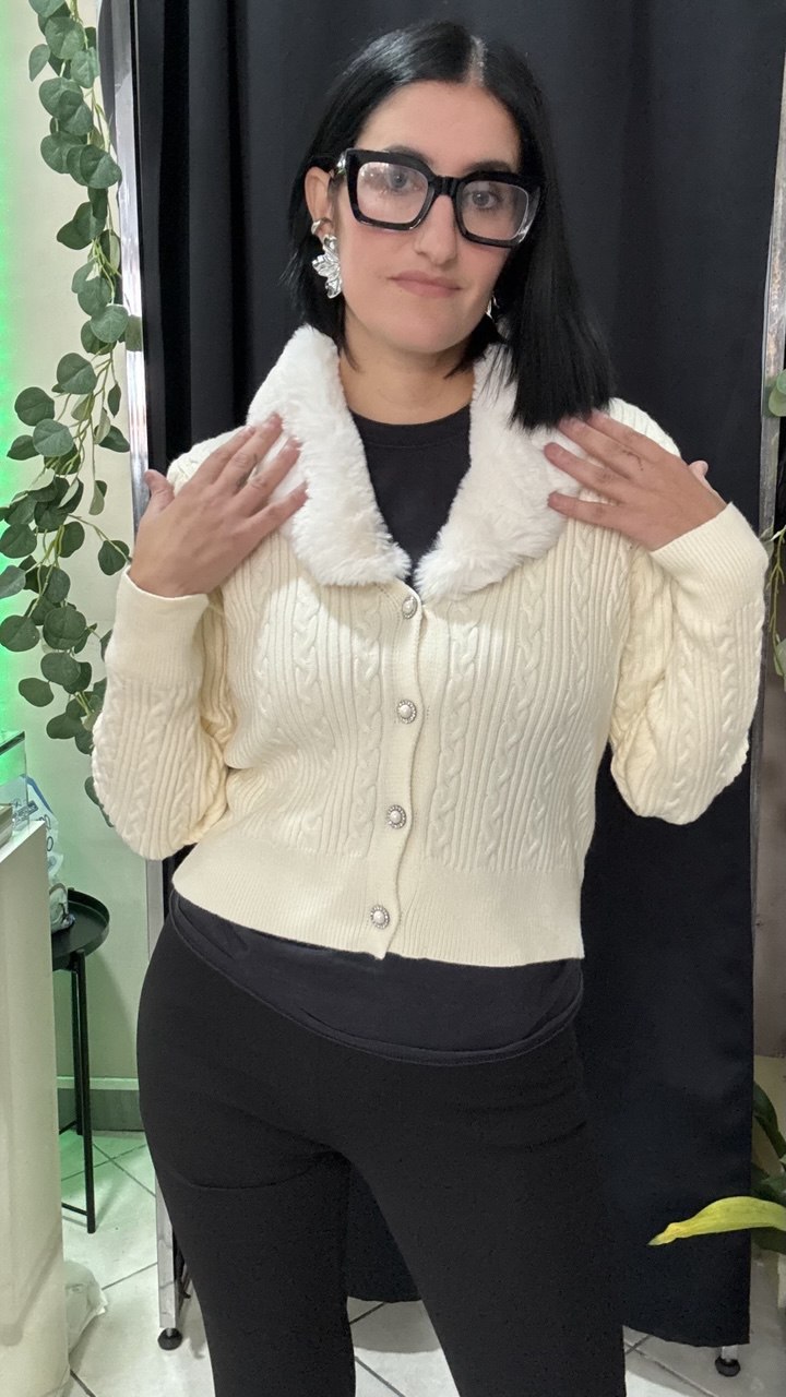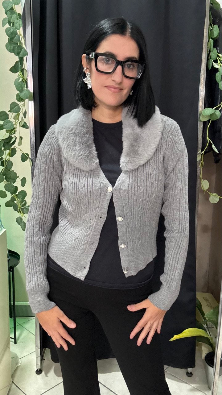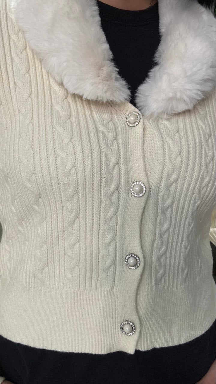 Cardigan con pelliccia ecologica rimovibile e bottoni di perla e stras.