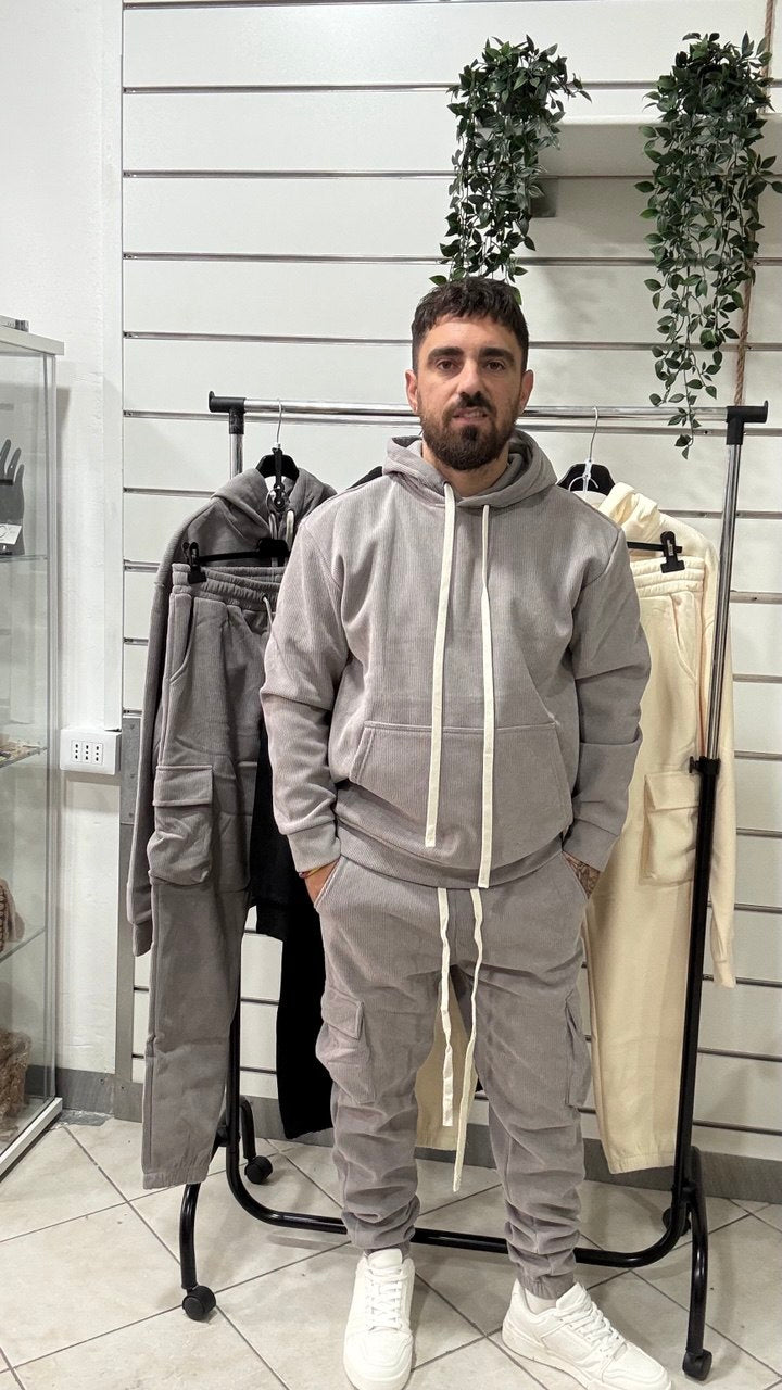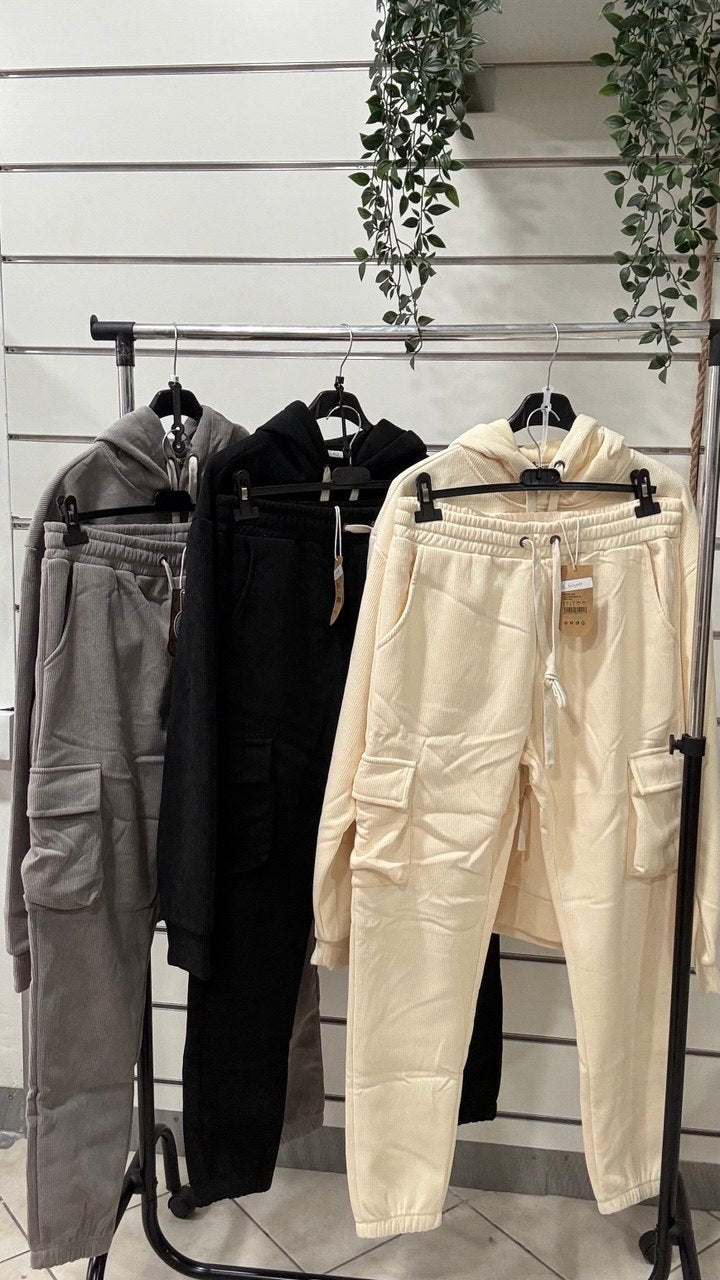 Pantalone cargo con elastico alla caviglia, felpa con cappuccio e tasche.